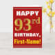 Las características del este de felicitación diseño cumpleaños-temáticas simples de la tarjeta un deseo caliente del cumpleaños tienen gusto del "93.o CUMPLEAÑOS FELIZ, Primero-Nombre!" en el frente, en texto intrépido en un rojo coloreó el fondo. El número del cumpleaños tiene un falso/una imitación oro-como mirada del colorante. El nombre en el frente puede ser modificado para requisitos particulares. Las características interiores un mensaje del cumpleaños que puede ser modificado para requisitos particulares. Una tarjeta de felicitación como esto podría ser una manera de la diversión de entregar deseos del cumpleaños alguien que está celebrando su noventa terceros cumpleaños. [~Z0000276]