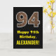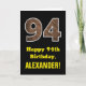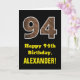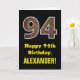 Este rústico y divertido diseño de tarjetas de felicitación con temática de cumpleaños cuenta con un gran número de "94" que tiene un patrón de estilo inspirado en los granos de madera falsa en la parte delantera. En la parte delantera también aparece el mensaje de bienvenida de cumpleaños "Feliz cumpleaños 94", y un nombre de destinatario editable. El interior presenta un mensaje de bienvenida de cumpleaños editable, o tal vez podría ser borrado y dejado en blanco si se va a escribir un mensaje a mano. Una tarjeta de cumpleaños personalizado como esta podría ser una manera divertida de enviar deseos de cumpleaños a alguien que está celebrando su cuarto cumpleaños. [~Z0000433]