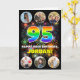La parte delantera de este audaz y divertido diseño de tarjetas de felicitación temática de cumpleaños incluye un gran número de "95" con un vibrante patrón de gradiente inspirado en el espectro del arcoiris multicolor, junto con el mensaje "HAPPY 95th BIRTHDAY", y un nombre editable, en un patrón inspirado en fuegos artificiales multicolores que rompen. Cerca de la parte superior e inferior del frente hay imágenes que se pueden personalizar, tal vez con fotos de la familia y amigos del destinatario. El interior tiene un mensaje de bienvenida de cumpleaños de personalizado, o tal vez podría ser borrado y dejado en blanco si un mensaje se va a escribir a mano en su lugar. Una alegre tarjeta de felicitación de cumpleaños de personalizable como esta podría ser usada para reconocer el cumpleaños noventa y cinco de alguien. (Fotografía © Storytree Studios, Stanford, CA.) [~Z0000660]