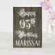 La parte delantera de este elaborado y lujoso diseño de tarjetas de felicitación con temática de cumpleaños muestra el mensaje "Feliz cumpleaños 95", en un texto ornamentado de escritura. En la parte delantera también hay un nombre editable para el receptor y un patrón de fondo inspirado en la madera falsa. El interior tiene un mensaje de saludo de cumpleaños modificable, o tal vez podría ser borrado y dejado en blanco si se va a escribir un mensaje a mano. Una elegante tarjeta de felicitación de cumpleaños de personalizable como esta puede ser enviada para celebrar el cumpleaños noventa y cinco de alguien. [~Z0000556]