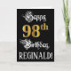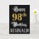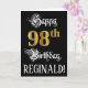 La parte delantera de este suntuoso y elegante diseño de tarjetas de felicitación temática de cumpleaños incluye el mensaje "Feliz cumpleaños 98", más un nombre de destinatario personalizado. Parte del mensaje está en un texto estilo script ornamentado. El gran número "98th" presenta un estilo de imitación dorado. El fondo es negro de color. El interior tiene un mensaje de bienvenida de cumpleaños de personalizado, o tal vez podría ser borrado y dejado en blanco si un mensaje se va a escribir a mano en su lugar. Una tarjeta de felicitación formal y personalizada de cumpleaños como esta podría ser una manera respetable de enviar un mensaje de felicitación de cumpleaños a alguien que está celebrando su cumpleaños noventa y ocho. [~Z0000559]