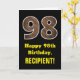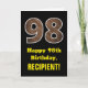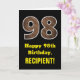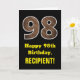 Este divertido y rústico diseño de tarjetas de felicitación con temática de cumpleaños cuenta con un gran número "98" con un estilo inspirado en el grano de imitación en la parte delantera. En la parte delantera también aparece el mensaje de bienvenida de cumpleaños "Feliz cumpleaños 98", y un nombre de destinatario personalizado. El interior presenta un mensaje de bienvenida de cumpleaños de personalizado, o tal vez podría ser borrado y dejado en blanco si se va a escribir un mensaje a mano. Una tarjeta de cumpleaños personalizada como esta podría ser una manera divertida de enviar un mensaje para celebrar los noventa y ocho años de alguien. [~Z0000433]