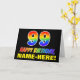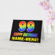 La parte delantera de este colorido, divertido y alegre diseño de tarjetas de felicitación de cumpleaños incluye un gran número de "99" y el mensaje "FELIZ CUMPLEAÑOS", ambos coloreados con un patrón inspirado en el gradiente del espectro del arcoiris, junto con un audaz nombre del destinatario del personalizable amarillo. En la parte delantera también hay un fondo de color negro claro. El interior presenta un mensaje de bienvenida de cumpleaños de personalizable, o tal vez podría ser borrado y dejado en blanco si se va a escribir un mensaje a mano. Una colorida tarjeta de cumpleaños personalizada como esta podría ser una manera divertida de celebrar el 99º cumpleaños de alguien. [~Z0000472]