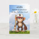 ¡Hagan que el noveno cumpleaños de su nieto sea inolvidable con esta tarjeta de béisbol personalizada! Un mono juguetón, murciélago en mano y guante listo, se para contra un cielo azul brillante, trayendo diversión deportiva a su día especial. Añade su nombre al frente para darle un toque personalizado que le encantará. Este diseño animado y alegre es perfecto para los amantes del béisbol de nueve años.