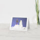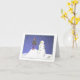A little boy wearing red boots and a red striped stocking cap needs to stand on a mound of snow to be able to talk to his snowman friend.