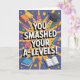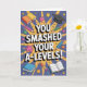 A cheerful and energetic congratulation card bursting with color and excitement! Featuring cartoon books, pencils, stars, and caps, this design shouts “You Smashed Your A-Levels!” — ideal for young achievers full of life and joy.