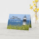 cita inspiradora personalizado La tarjeta del Día del Padre para el abuelo representa un faro blanco y negro con flores amarillas bonitos y un fondo azul océano y cielo. El interior presenta la Biblia Verse Philippians 1:2-3, "Gracia y paz para ti de Dios nuestro Padre y el Señor Jesucristo. Le doy las gracias a mi Dios cada vez que te recuerdo"._