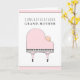 Carta de felicitaciones a la nueva abuela con temática de piano que incluye un piano de cola y un chica de recién nacido.