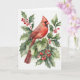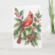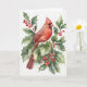 Acuarela de cardenal y acebo con bayas. El interior de la tarjeta dice "Feliz Navidad" en el lado izquierdo en rojo.