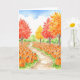 Esta tarjeta de saludo tiene un retrato acuático de un camino que conduce a través de un parche de calabaza rodeado de coloridos árboles caídos.
