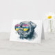 Este diseño presenta un pug que mira a través de lentes de sol en una escena tropical.