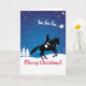 Una hermosa escena invernal con Santa volando con sus renos en el cielo mientras un hermoso caballo de adiestramiento actúa sobre el saludo "Feliz Navidad". Si te gusta este diseño, echa un vistazo a mi tienda Patty's Pet Art para más diseños ecuestres.