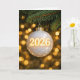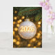 Un adorno de vidrio que significa el año 2026 cuelga de una rama de pino, iluminado por el cálido resplandor de suaves luces doradas.
