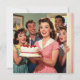 A fun surprise birthday party invitation for an adult woman. The front illustration is a group of retro mid-century friends gathering to surprise someone for their birthday holding a cake with funny awkward expressions. ON the back it says, "Surprise" in a comic book pink and teal pop art vibe. Add all your birthday part info in the personalize area!