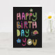 Una manera divertida y festiva de celebrar un día especial, esta tarjeta incluye las palabras "Feliz cumpleaños para ti" con tipografía audaz y colores vibrantes. Su mensaje destacará gracias al estilo audaz y a la forma en que los colores contrastan con el fondo negro. Puede modificar el texto interior o eliminarlo por completo.