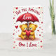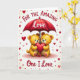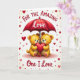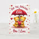 This romantic Valentine's Day card shows two golden teddy bears with rosy cheeks sitting close together on a soft pink oval. They look gently at each other while holding a shiny red heart between their paws. Above them is a red umbrella that says “love” in white script across the canopy. In the upper area, the message “FOR THE AMAZING” appears in red block letters, and below that, “One I Love” is written in a flowing script. The background is creamy white with lots of small hearts scattered around in shades of red and pink. The overall scene feels sweet and caring, with warm colors that fit the holiday ❤️💌🍫.