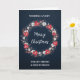 Feliz Navidad para una amiga y su esposo con una corona de nieve rústica y follaje de invierno con poinsettias.