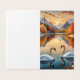 La tarjeta presenta una impresionante escena de dos elegantes cisnes formando un corazón con sus cuellos en un tranquilo lago. Recorren con gracia el agua, rodeados de delicadas flores flotantes que besan suavemente la superficie. En el fondo, majestuosas montañas se alzan contra un cielo pintado en cálidos tonos de atardecer dorado, insinuando un mágico atardecer. Árboles de colores otoñales enmarcan la escena, mientras que la nieve suave y brillante cubre el paisaje, evocando una sensación cálida pero cálida. El ambiente encantador invita a disfrutar de la calidez del amor y la paz durante la temporada festiva.