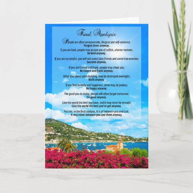 El poema hermoso, inspirador "análisis final" se fija contra una escena imponente en el mediterráneo. Ésta es una adaptación del poema "los mandamientos paradójicos" escritos por el Dr. Kent M. Keith como estudiante en Harvard en 1968. El poema se ha desarrollado durante décadas de transmisión, y las variantes múltiples se han publicado en periódicos, libros, y revistas. Los mandamientos se han atribuido incorrectamente a otros individuos. Imagen de alta resolución (dpi 300).