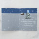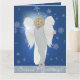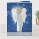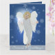 Un ángel visita una cabaña remota para entregar la luz de la Navidad en un entorno invernal completo con copos de nieve y estrella de Navidad. Un saludo perfecto para las fiestas!