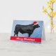 Una foto de un toro Angus negro con un sombrero de Santa sobre un fondo de nieve es perfecta para el criador de Angus.