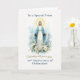 Creado para honrar a un sacerdote que celebra diez años desde su ordenación, este diseño mariano refleja una década de servicio marcado por la devoción, el cuidado pastoral y el creciente liderazgo dentro de la Iglesia. La presencia suave de Nuestra Señora y las flores azules suaves ofrecen una expresión de oración de gratitud por una vocación vivida con fe y dedicación.