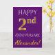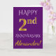 Este diseño simple y personalizado de tarjeta de felicitación para el aniversario de bodas presenta el mensaje "FELIZ 2do ANIVERSARIO", con el "2do" teniendo una apariencia similar al falso oro. La parte frontal también presenta un nombre personalizado y un fondo de color púrpura. El interior presenta un mensaje de felicitación personalizado para el aniversario de bodas. Podría ser entregado a un esposo o una esposa en celebración del segundo aniversario de bodas de la pareja. [~Z0000089]