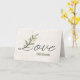 AMAR el texto en un elegante tipo de letra con hojas verdes y nombres de pareja en el aniversario del fondo de textura suave neutra.
