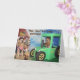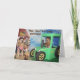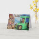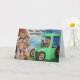 Esta tarjeta incluye los recuperadores de oro como agricultores. Uno conduce el tractor mientras el otro rastrilla el heno. El texto dice: "¡Hay, Hay! ¡Es tu cumpleaños!" y "¡Espero que te diviertas!".