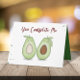 Este diseño presenta dos lindos aguacates feliz aniversario lindo divertido, moderno y caprichoso personalizado de humor, para el aniversario de la pareja de esposos, un simple estilo minimalista mínimo, de la foto de la esposa del marido, me completas la cita diciendo, graciosas tarjetas de felicitación de aniversario, con cómics de comida de frutas aguacate, matrimonio de marido y mujer, obra de laura lacina