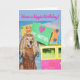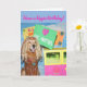 Esta tarjeta presenta a un recuperador de oro como hippie con carteles de protesta y un autobús hippie. El texto dice: "¡Que tengas un cumpleaños hippie!" y "Deseándote amor y paz en tu día especial".