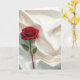 Una rosa roja yace con gracia sobre una tela de satén suave y blanca con una hebra de perlas. Se puede cambiar el texto interior.