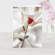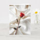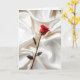 Una sola rosa roja de tallo largo yace elegantemente sobre una sábana satinada blanca creando un sorprendente contraste visual. Se puede cambiar el texto interior.