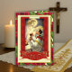 Celebre el Aniversario de Sacerdocio con esta hermosa imagen de un sacerdote católico celebrando la Misa en el Altar con Jesús colocando una corona en su cabeza. Dentro hay un versículo de la Escritura de la Misa con un versículo opcional dentro. Rosas rojas bordean la tarjeta.