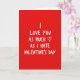 This bold card makes a strong statement with confidence and humor. A bright red background fills the design, setting a passionate tone right away. Centered in white, hand-drawn style lettering is the message, “I LOVE YOU AS MUCH ♡ AS I HATE VALENTINE’S DAY.” The contrast between the red and white makes the words easy to read and impossible to ignore. The heart symbol slipped into the sentence adds a touch of sweetness that balances the sarcastic edge. The lettering feels personal and relaxed, as if written just for the recipient. This card blends honesty, affection, and wit, making it perfect for someone who loves deeply but isn’t sold on Valentine’s Day clichés.