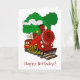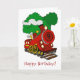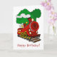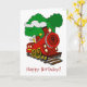 Un lindo tren personalizado con el número 9 delante y humo que viene del montón y árboles en el fondo.