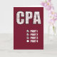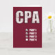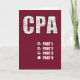 Un buen estudiante ha superado tres partes de la prueba de CPA. Felicitaciones después de pasar estas partes importantes. Este elegante diseño en rojo oscuro, negro y blanco con las tres primeras partes marcadas es perfecto para un hombre o una mujer. Hay más cartas maravillosas en esta serie de felicitaciones de la CPA. Encontrará uno para pasar cada parte de la prueba. Será una encantadora sorpresa recibir sus felicitaciones de esta manera.