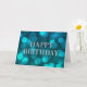 Tarjeta de saludo de cumpleaños de moda con las palabras "Feliz cumpleaños" en Relieve metalizado de plata falsa contra un fondo de patrón de luces de bokeh azul acuático. Para agregar texto al interior de la tarjeta, haga clic en el botón "Personalizar". *Tenga en cuenta que la marca de agua Zazzle que aparece en la vista previa del zoom NO aparecerá en el producto impreso final. © Rosewood y Citrus