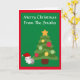 Tarjeta de Navidad personalizada adorable con árbol de Navidad y gato adorable con sombrero de Santa. Saludo de Feliz Navidad en la portada.