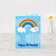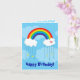 Una carta de cumpleaños con un impresionante arco iris vectorial sobre un fondo azul. Se curva para encontrarse con las nubes blanquecinas de cada lado. La nube derecha tiene un corazón rosado decorándolo. Llueve sobre 4 estrellas amarillas y 6 gotas azules de lluvia.