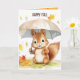 Ardilla torta con paraguas y hojas de otoño sobre fondo blanco