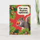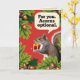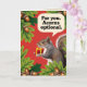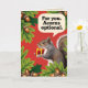 Una ardilla roja se aferra a un pequeño paquete de regalo, rodeada de hojas de roble y bellotas sobre un fondo rojo brillante.