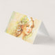 A soft, watercolor-style portrait of a young woman in three-quarter profile, gazing upward with luminous green eyes and coral-pink lips. Her wavy golden hair flows in loose curls, interwoven with delicate white daisies and green foliage, creating a natural garland. Rendered in warm pastel tones with gentle, diffused lighting and subtle watercolor bleeds, the artwork evokes an ethereal, romantic mood that blends beauty and nature
