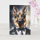 Arte de salpicaduras de acuarela linda de un perro Pastor Alemán en un esmoquin y corbata negra única en esta tarjeta de felicitación en blanco.