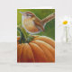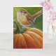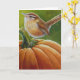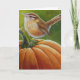 Tarjeta de felicitación de arte en acuarela "Chochín pequeño, chochín pequeño" de la artista Jean Weiner "Chochín pequeño, chochín pequeño" presenta un pájaro chochín de Carolina posado en una calabaza naranja madura. ¡El otoño está en el aire! ¡Este pequeño pájaro pronto tendrá muchas comidas de semillas de calabaza! Este pájaro favorito es un visitante bienvenido en el patio trasero. ¡Seguro que deleitará a cualquier amante de las aves! Comparte este diseño con tus seres queridos y haz que su Día de Acción de Gracias sea feliz.