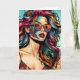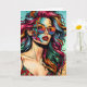 Tarjeta en blanco para solo saludar, o para cualquier ocasión. Arte ai único que representa a una hermosa mujer moderna con cabello colorido y gafas de sol en un bikini en la playa con un reflejo en ellos. Arte pop de cómic fracturado.