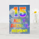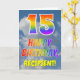 Este divertido y colorido diseño de tarjetas de felicitación de 15 años presenta una representación de un cielo azul nublado, junto con un gran número "15" y el mensaje "FELIZ CUMPLEAÑOS", con un colorante de patrones de gradiente inspirado en el espectro arcoiris, en la parte delantera. En la parte delantera también se muestra el nombre personalizado del destinatario de la tarjeta. El interior presenta un mensaje de bienvenida de cumpleaños de personalizable, o tal vez podría ser borrado y dejado en blanco si se va a escribir un mensaje a mano. Una tarjeta de cumpleaños personalizada como esta podría ser una manera divertida de reconocer el décimo quinto cumpleaños de alguien. [~Z0000371]