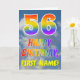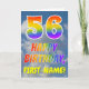 Este divertido y colorido diseño de tarjetas de felicitación de 56 años presenta una representación de un cielo azul con nubes, junto con un gran número "56" y el mensaje "FELIZ CUMPLEAÑOS", con un colorante de patrones de gradiente inspirado en el espectro arcoiris, en el frente. La parte frontal también incluye un nombre de destinatario de personalizable. El interior presenta un mensaje de bienvenida de cumpleaños personalizado, o tal vez podría ser borrado y dejado en blanco si se va a escribir un mensaje a mano. Una tarjeta de cumpleaños personalizada como esta podría ser una manera divertida de enviar un mensaje para celebrar los cincuenta y seis años de alguien. [~Z0000371]