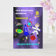 Una imagen del tema del espacio ultraterrestre en un personalizado muy lindo con un astronauta en el espacio, un cohete, estrellas, planetas y nave espacial; un diseño tan divertido y colorido y fácil de personalizar con un nombre, edad y mensaje, por ese toque especial extra sin costo adicional.
