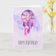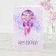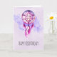 Una tarjeta de cumpleaños elegante, mágica y mística. Un diseño temático de nativo americano creado con acuarelas. Un atrapasueños de acuarela rosa con un aro tejido y delicadas plumas colgando. Puesto sobre una salpicadura de pintura morada con un fondo morado claro. Puedes editar el mensaje interior o personalizarlo fácilmente como desees.